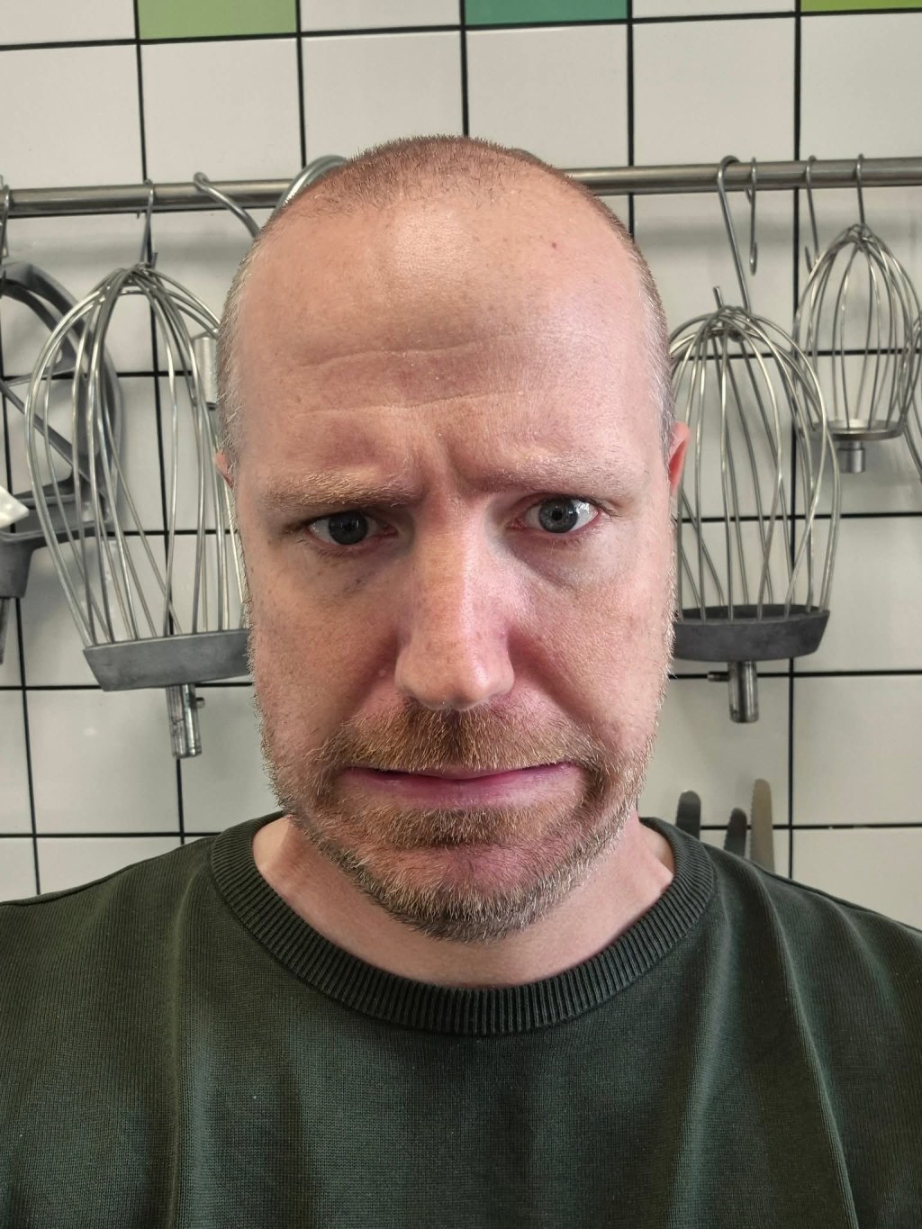 Sådan ser Chris’ ansigt ud, hver gang han her til morgen har kigget ud af vinduet, og set folk køre forgæves efter morgenbrød – for det ønsker vi selvfølgelig ikke.