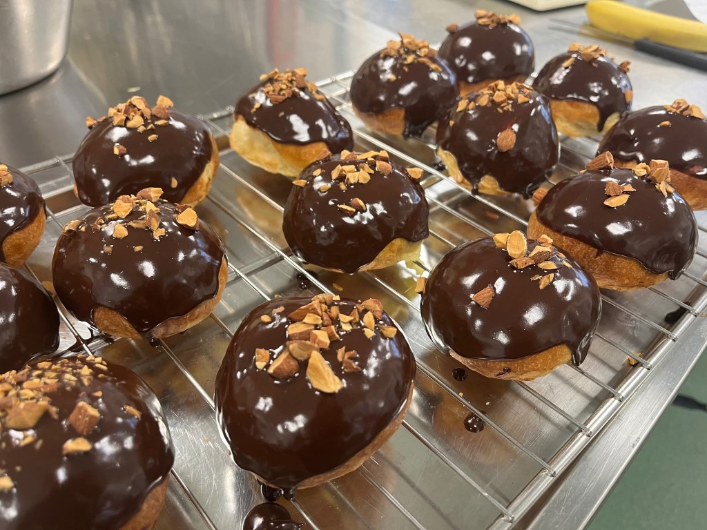 Vi har bagt fastelavnsboller med creme i og søde Agnes har lavet en lækker chokoladeganache og dyppet dem i.