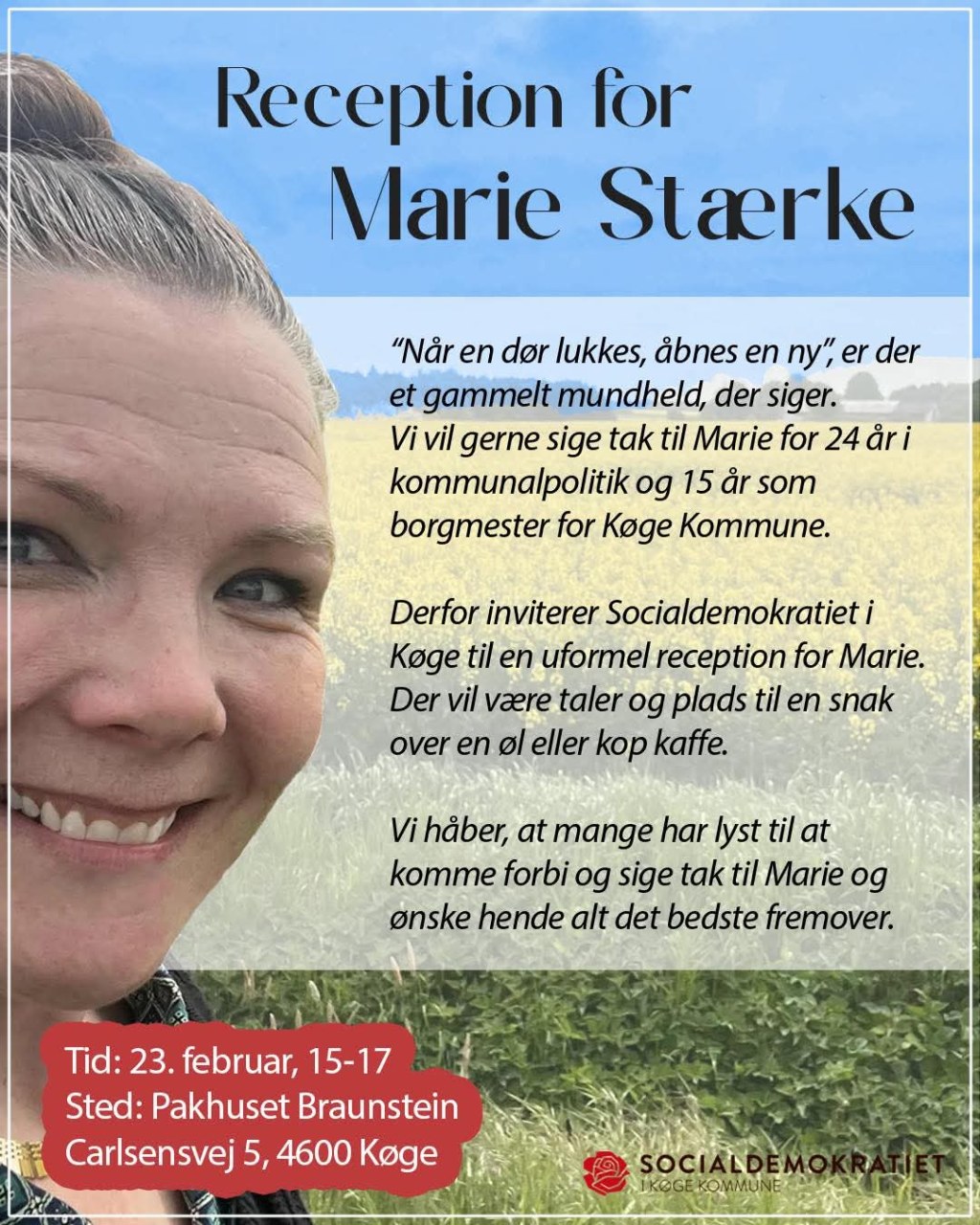 Jeg har været valgt til Køge byråd i 24 år og i 15 af dem var jeg borgmester [for bl.a. #Herfølge]. Nu er det tid til noget nyt for mig. Jeg er så heldig, at Socialdemokraterne i Køge gerne vil fejre skiftet og sende mig godt videre. Hvis du vil være med til det, er du velkommen.